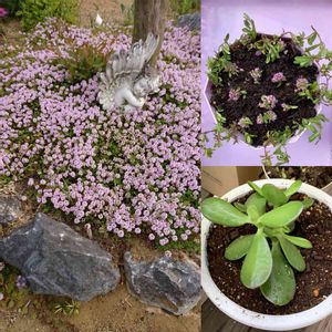 左写メは同僚のお宅の 「クリーピングタイム」🌸 センペルビウや金の成る木、クリーピングタイムも頂きました♥️ クリーピングタイムはとってもいい香りがします💓今朝の植え替えなので..根付くけ心配😿