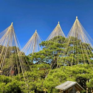 おはようございます☁️ 秋晴れの日に 兼六園へ紅葉を見に行きました🍁 雪吊りが 青空に映えてきれいでした✨️ 2枚目には 徽軫灯籠(ことじとうろう)が写っています。