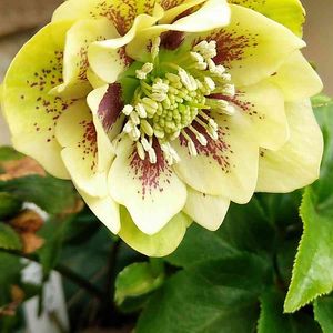クリスマスローズ 55 バターイェロースポット ミヨシの、パーティードレスシリーズです。昨年は沢山のお花を咲かせてくれたのに、今年はまだ1つだけです。 小輪の黄色ダブルで、赤いスポットが入っています。 こちらも10年前から苗から育てています。