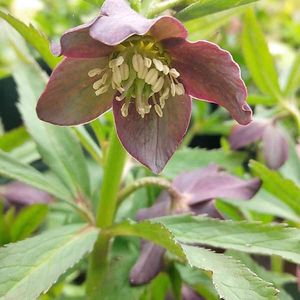 クリスマスローズ 59 クロアチクス 名前は原産地のクロアチアに由来しているものです。 花弁の裏側は濃紫色、表面は緑色の地に濃紫色か入ります。花付きもよく、沢山の花を咲かせます 山野草の風情を感じさせる、小さくてかわいらしい原種です