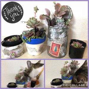 多肉な彼女さん、勝手に略してタニカノさんのイベントでget!! 暴れ多肉の良さを知り、2つで悩みに悩んで結果全然違う物にしましたー(☝︎ ՞ਊ ՞)☝︎ 海外製の物が好きなのでリメ缶に一目惚れして、暴れ多肉は次回出会えるまでとっておきます( ˊ̱˂˃ˋ̱ ) 帰宅後は早速モコさんのチェック入りましたー(・Д・) プレゼント多肉2つも頂けたので邪魔されないところで寄植え頑張ろーっと!