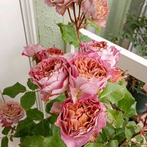 ①レモンマートル ②斑入りのマートル ③エクレールと嬉しい出会いがありお迎えしました。YouTubeを見て、お迎えしたいな〜と思っていたんです。 レモンマートルは、本当にレモンのいい香りです🍋 ④先日、香川県高松市の憧れの園芸店「GADENS」に行く事ができ、①②③と出会えました。 ⑤今朝、庭でバラ サフィレットが咲いてくれたので、淡路島の産直店で購入して来た切り花グリーンのマムと飾りました。