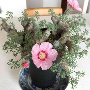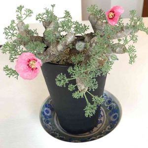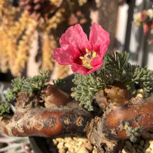 サルコカウロン・ムルチフィズム お迎え:2019/ 5/22 撮影 :2019/ 6/30 お迎えして数日後には枝に何やら変化が出ていましたが、やっと咲きました。 購入時はベラルゴニウム?→指摘を受け、サルコカウロン? と変移しましたが、これで確定 この花の色はムルチフィズムとパターソニーのどちらか。 ブロッチがある事、枝に棘がない事でムルチフィズムで間違いないでしょう⸜(*ˊᵕˋ*)⸝ Sarcocaulon multifidum 和名 :月界 タイプ:冬型塊根 国際標準では Monsonia multifida (モンソニア ムルチフィダ)という学名が主流 日本では旧い名前のほうが通りが良いようだし慣れているので今暫くはサルコカウロンでいこうかなと思ってます。 樹脂を多く含みよく燃えるので、現地ではブッシュマンの蝋燭などとも呼ばれます。
