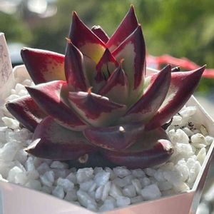 多肉植物 レモンティー あれ?なんか別嬪さんがいるよ👀 と見たら、レモンティーさんでした〜💕 エッジの透き通る白 中央の赤 下葉の緑 そしてウォーターマーク この時期ならではの美しさにうっとり〜 はぁ、癒される〜 心が浄化されるわ〜