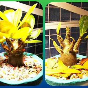 アデニウム (IKEA ミニ温室&育成ライト組) 左は1週間前の姿です。 1週間でこんなに落葉してしまい、ちょっと寒そうだね😅 🌱