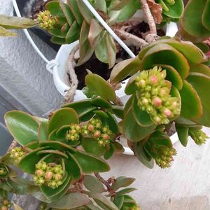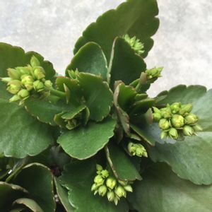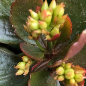 一部霜にやられた葉があるなか、つぼみをつけているカランコエ