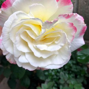 HT ダブルデライト🌹 ☔️雨の降る前の姿☔️ とても良い香りがしていました。 残念ながら、今は雨に打たれて下を向き、 外側の花びらが散ってしまいました😞 次の蕾に期待しよう❣️