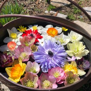 バードバスもどき こんにちは、しばらくお休みをいただいていました。術後の体調が良くなりましたので、投稿させてください。 バードバスに見立てて、鉄製のすき焼き鍋に浮かべました。 心がほっこりしました。