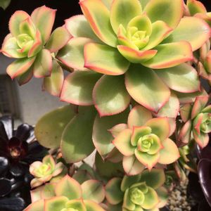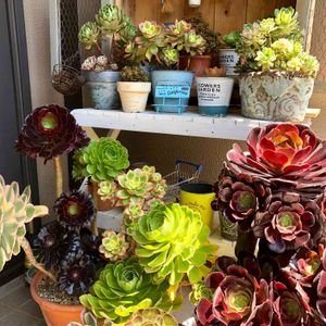 休眠前のアエオニウム🍃🌱 皆んな大きくなって手狭になってきたねぇ〰️😊💖 黒法師 レモネード 伊達法師 サンバースト 小人の祭り(黒法師で見えてない) もう植え替えはギリ心配なので秋にはおひとり様にしょうかな〰️…🤔💭