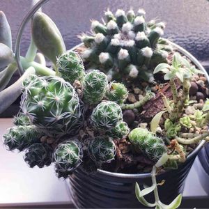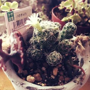 金盛丸💗黄金司 白 鳥 💗 金 鯱 natural kitchenでget🙌 ひとつ100円でしたが ダイソーのものより大きい💓 黄金司斜めになってる💦💦 子?がぽこぽこ👶💓 あったかくなったら 植え替えしようかな? 株分け??? ん~今はこのままにしておこう😊 あ、家マミラリアだらけだ(笑)
