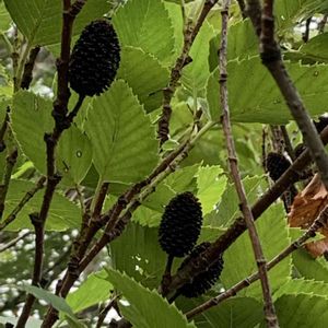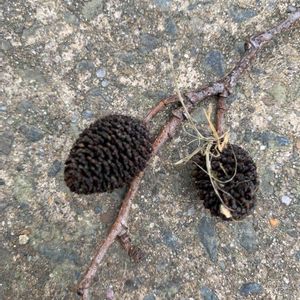 散歩の途中🚶♂️ 公園の木 🧡ヤシャブシ(夜叉五倍子)の果穂🧡 カバノキ科 ハンノキ属の落葉高木 日本固有種で西日本に多く自生する。 名前の由来: 熟した果穂がゴツゴツした形状なのを夜叉に見立てた。 果穂はタンニンを多く含み、五倍子(ふし)の代用として、黒色の顔料やお歯黒などにつかわれたため。 葉が展開する頃に開花する。 枝の上方に雌花序、その下部に雄花序がつく。