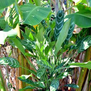 バナナの根本に置いたアグラオネマ。 程よく日差しを受けていられるようで、順調な生育っぷり。 なんかこう、ジャングル感があるね。