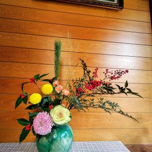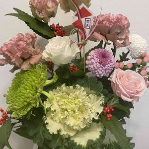 Happy NewYear❣️ 今年もどうぞよろしくお願い致します🎍🪭 今年は松や千両は入れずにお正月らしいお花を生けました。 自己流ですが… 母の四十九日に贈って頂いたお花もちょっとピンクを入れて華やかにしてみました😊