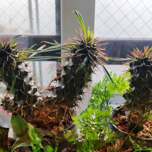 パキポディウム ラメリー 立派に成長してますよ。 ミニ観葉でお迎えして2年経ちました。 逆光も相まってかっこいい😆 心配なのは右の一本の頭頂部が寂しいこと、、 左の頭頂部は緑のトゲトゲが出てきてるので今年も成長に期待👍🏻