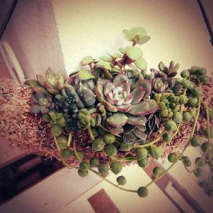 昨日、思いがけず多肉時間が出来たので思いつきでタブロー作りました! 木に穴開けたり釘や金槌の準備してないから、板にドーム型にしたチキンネットをグルーガンでくっ付けただけ。 中身はヤシ繊維➕ネルソルです。 苗を植えたらそれらしくはなったけど……ちゃんと育ってくれるか不安だわ。