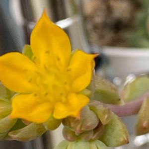 中々ピントが合わないけど、スノージェイドのお花が咲きました❣️ 凄い風だけど、ベランダの多肉棚大丈夫かなぁ😨