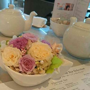 お友達の誕生日祝いで、アフタヌーンティーへ プリザーブドフラワーのアレンジメントをプレゼントしました🌼🎁🎂