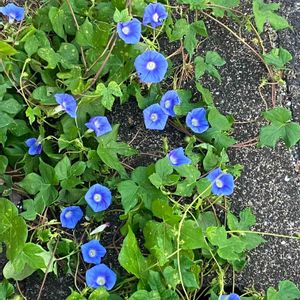 今朝撮りアサガオ 側溝にこぼれ種から咲いた小さなアサガオ 今迄で一番多く(18個)咲いてます^_^