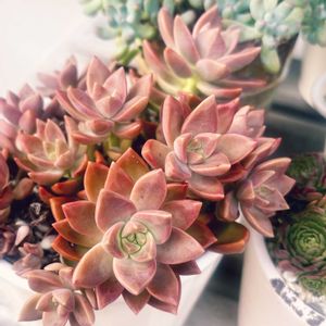 真夏の西日を寒冷紗一枚で乗り越えてきた多肉たち ①ササはキュっとしててかわいい ひとまわり?ふたまわり?小さくなりましたが… ②シテリナ この佇まい、好き ③カリフォルニアサンセットは暑い季節でもこの色をキープしてるのがかわいい