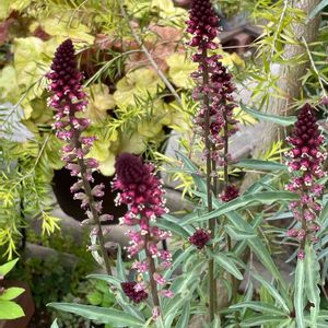 左はトリカラーセージ、右は斑入りの金魚草、奥にある鉢はガイラルディアグレープセンセーション🍇