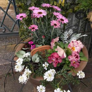ローダンセマムをメインに💕 お庭の子達を寄せてみました🎶 ♪ローダンセマム リルピンク ♪絞りパンジー ♪ダスティーミラー ♪シクラメンコウム ♪イベリス ♪黒竜 見切り品でお迎えしていたイベリスが 沢山のお花を咲かせて いい仕事をしています💕