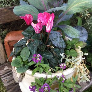 お庭のいろいろ集めて💕 ✨✨小さな寄せ植え✨✨ メインはガーデンシクラメン クレヨン💖 種まきっ子のビオラを両サイドに 前面には〜 こぼれて落ちたスイートアリッサム♪ 長く伸びてカットしたセラスチューム♪ そして一番後ろは〜 4ポット50円の赤キャベツ🎶 寄せてからひと月程過ぎて🎶 みんなだいぶ大きくなりました💖 特に赤キャベツは色も変わり緑キャベツ🤣