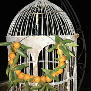 🐤小鳥さん いらっしゃい🎶💕 ワイヤーでブスブス通して 金柑リースの出来上がり〜🎶 夕食後に作ったので 外は真っ暗🌠 鳥かごにぶら下げてパシャリ📸 後で、リビングから見えるアーチに移動します💕