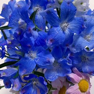 今日のお花、デルフィニウムの、スプレー咲になる、シネンシス・ブルーと、シェルピンクです。オーロラ系などの豪華な花穂になるエラタㇺと異なり、ブーケのようにふんわりと咲くところに魅力がありますね😊
