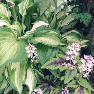 4月の終わり。 ここに最初からいた南天の木陰。 ギボウシと花火みたいな可愛い子。 放ったらかしでも花を付けてくれます。 後者は株分けして紫陽花の根元と玄関の方へして移動。 ススキの浸入のため、南の子は皆移動中ですが、ギボウシは無理かな……。