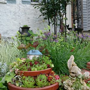2段重ねの植木鉢に、多肉を植え込んで多肉タワー♪ 100均の小物を隙間にチョコチョコ飾ってます。