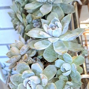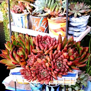 おはようございます😃🌤 ピンクルビー(中央)💥とクリスマスイブ(両脇)🎅 @軒下の多肉棚🗼 ダイソー出身のピンクル、六度目の冬、お子ちゃま鉢多数👶👶👶 3区画ケースも引っ掛けカゴもダイソーからの嫁入り道具、ダイソー・アクリル ペイント🎨🖌️