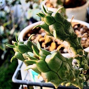 おはようございます😃🌤 グロボーサ (ユーフォルビア)👽 個体差が大きいグロさん、ウチのはニョロンな棍棒系、1/2 キングギドラ的ドタマと、2/2 写しにくい全体図、ニョロンがツ~✌️😅 よい一日を🐬.。o○🌈🌏