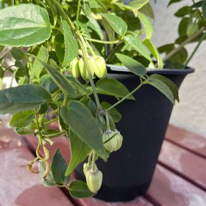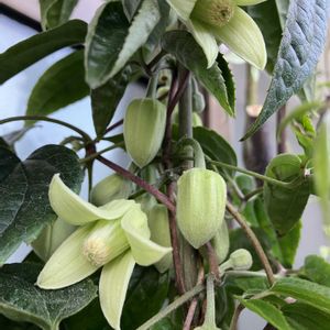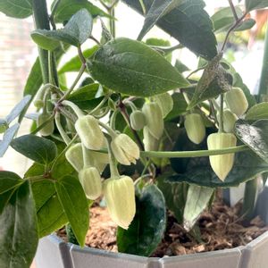 昨年末に花期12月〜2月のクレマチスアンスンエンシスに出会い迎えました🌸 天使のすずと記載されていました❣️ 昨日から開きかけて今日開きました🌸 鈴のような白い花が沢山咲いてくれそうです蕾も可愛いですね🤗