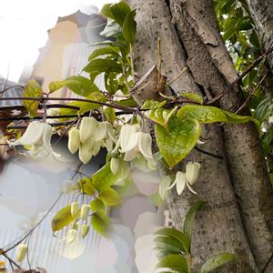 アンスンエンシスさん 咲いてました🤍 朝 明るくなり始める頃家を出て 暗くなって帰宅するため なかなか写真におさめることができませんでした。 今年はツボミが落ちる事は無かったけど、やはり暴れん坊将軍は ②塀を越え ③隣のキンモクセイを伝い ④自作の巣箱の上の方までいってました💦 今年は全くお手入れしなかったからなぁ😅ごめんっ🙏💦