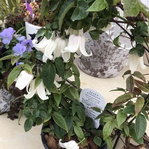 冬咲クレマチス、年末にお迎えして、蕾の期間が長かったけど開花㊗️! もっと咲いたら玄関前にかざってみたい これはハンギングだともっと可愛いかも 常緑なので春に植え替えてみよう