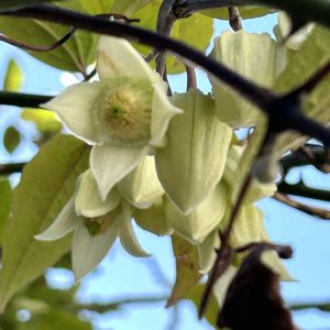 キッチンの窓から見えるクレマチス・アンスンエンシス 今朝、メジロがチョロチョロしているので、よく見てみたら少しだけ開花していました😆✨ 半分枯れ枝に蕾がついているところもありますが、蕾は枯れてないみたい。これからもっと咲くと思うと嬉しいです。 メジロさんいっぱいきてね🎶
