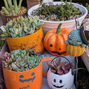 おはようございます 🎃ハロウィンコーナー🎃👻 かぼちゃに目と口を書いただけで、昨年の鉢をそのまま使用しました💦 孫に見せたらハロウィンはもっと怖い顔にしなきゃとダメ出し😵何を言われても可愛い🤭