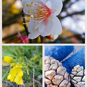 プチデートしてきました😻 ↪️チャーシューメン、食後のコンビニコーヒーの時、駐車場から見えた白梅、HCから連れ帰った黄色のハゲチョロケ花キリン🦒