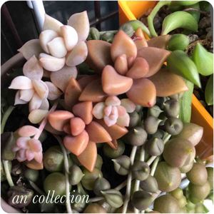 2018-3/9 ☁️10.0℃🌡ベランダ軒下 ~~~ヾ(^∇^)おはよー♪ よぉ☔️降った😶今日は☁️→☀️予報🤗 グリネ挿し芽からのミニポットの葉挿しチャン's👯 365日軒下放置で水遣り適当の放任スパルタ😜 主役のグリネ押し退けて葉挿しからの🌱ブロンズ姫達がプックプク♡ムッチムチ可愛いなってる❣️ 白いのは何やった❓可愛いけど名前わからん😅 右側チョイ出演は三日月ネックレス🌙