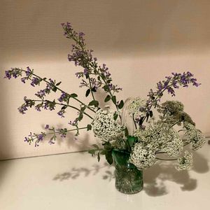 野良人参🥕とキャットミント🐈明日雨☔️予報なので✂️我が家の暴れる君兄弟👬地植えでも暴れ‼️生けても暴れ‼️選んだ花器が悪かった😱一日だけしかもたないかも?だけれど‥🌼🌸
