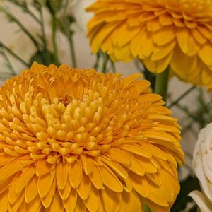 いただいた花束💐です。 八重咲きガーベラが見事~😆 毎日寒いですね、氷点下と霜との根比べも、もうそろそろ終わりますかね~ 毎日-5℃~+5℃ぐらいで庭の花鉢苗は凍えています。 豪雪地帯のみなさん、ご無事でありますように~ m(_ _)m