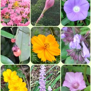 こんばんは🙋 朝散歩より~ サルスベリから時計回りに ゼフィランサス・サフランモドキ ノアサガオ アキノタムラソウ 星咲きアサガオ ヤブラン キバナコスモス💛 ヒヨドリジョウゴの実 キバナコスモス🧡