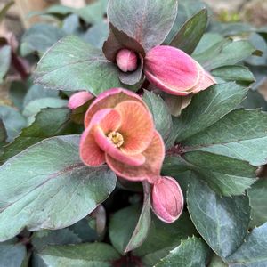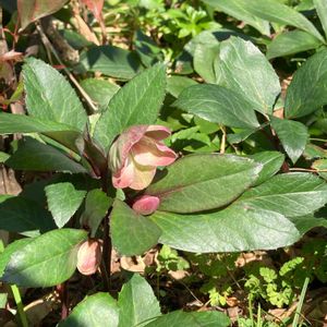 新たに 童仙房 ピンクフロスト🌸🎶No.23 一昨年とても賑やかに咲いてくれて、お気に入りだったのに、今年は消えてました😆 なので、未練がましくお迎えしちゃいました😊 前のはもう少しサーモン系、こちらは少し赤みが強いようですね💗 🏷ヘレボルス ゴールドセレクション HGCピンクフロスト