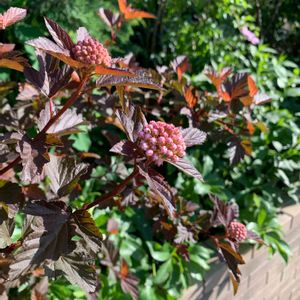 ボーダー花壇に植えているアメリカテマリシモツケ🇺🇸ディアボロです😀 とにかく、この銅葉ブロンズリーフが素敵で💕花壇のアクセントになっています。 今年は冬の間に、余った馬糞堆肥を撒いたので、花も大きいです☺️ おすすめの低木です。