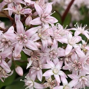今日の花【カネノナルキ】 なぜ、「金のなる木」という縁起がよさそうな名前になったのかと言いますと、昔から、遊び心で新芽に5円玉のような穴の開いたお金を入れておくと、茎の間に5円玉が挟まって、木にお金がなっているように見えるので、「金のなる木」と呼ばれるようになったそうです。 金のなる木は、株が小さいうちは花が咲きにくく、開花までには5~6年以上かかる場合があります。樹高が30cmを超えてくると冬~早春にかけて花を咲かせ始めます。 🩷小さなお花がたくさん 可愛い ですね(*´`)