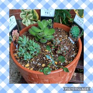 1号鉢で売られていた多肉さん達を寄植えしてみました。 息子が拾ってきた干からびたマンネングサも。生き返ってくれることを願って!