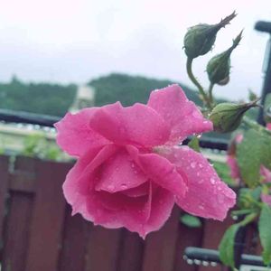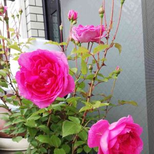 いつもありがとうございます😊 つるバラ パレード 濃いピンク色 四季咲き 房咲き率が高く、 花持ちは、とてもいいです🙌 棘が大きいので、 誘引時などは注意です😅 台風にも耐えて、咲いてくれました😄