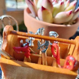 おはようございます。 ローズガーネットと 可愛いミニチュア工具😘 今朝は風の音で目が覚めた💦 今日も強風で、やだな😱 昨日、寄植え用の苗たちが箱ごと飛んで探すのに一苦労😰 2.3個見つからない💦