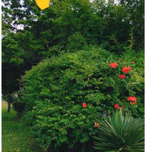 おはようございます🖐️😊☔️ 7/18picのノウゼンカズラサンはまだ咲いていました😍 元気カラーが良いですね😊 侵略している木🌳の上でもまだ咲いています😍 今日は朝から☔️、珍しく雷⚡️も鳴っています😱