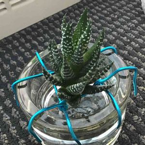伊豆シャボテン公園で買ったサボテンとアロエの寄せ植え。アロエさんだけが大きくなり、徐々にサボテンさんを圧迫。なんだかサボテンさんが可哀想なことになってました。 職場の園芸マニアの先輩に相談したら、植え替えてくれると言うので、遠慮なくお願い。可愛く植え替えてもらって、今日受け取り。しかし、持ち運び時のハプニングにより、家に着くときにはぐちゃぐちゃに…!植え替えてもらった意味なし!!結局、分からないなりに自分でやり直してみました。 しかも、土が乾いてて固定しづらいので、禁止されていたにも関わらず、水浸しにするというタブーを強行。無事に定着してくれるだろうか…??とりあえず今は、置き場所を片付けるまで、バスルームで待機しててもらってます。 「名前を教えて!」は、自分で好きな子を選んで寄せ植えにしてもらったのですが、その時名前を見て選んだのに、すっかり忘れてしまいました。100均等では見かけないのを選んだつもりです。見づらい画像ですが、もしご存知の方がいらっしゃったら、ご教示いただけば幸いです。